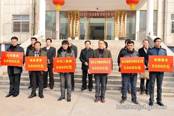湖北省建筑科学研究设计院、南国置业、武汉正华建筑有限公司、中交二航局、福星惠誉、山河集团共六家企业向云梦县沙河乡四个村捐赠了建设资金。厅领导分别走访慰问了李店社区困难农户,并送上慰问金。