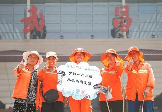 图为:武汉市武昌火车站西广场环卫班组