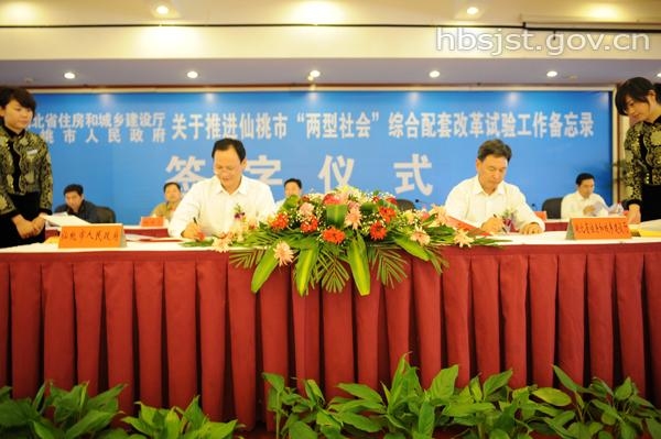 本网讯 记者曹琳报道:10月14日下午,省住房和城乡建设厅与仙桃市人民政府关于推进仙桃市“两型社会”综合配套改革试验工作备忘录签字仪式在仙桃市举行。省住房和城乡建设厅厅长李德炳、副厅长杨世元、仙桃市人民政府市委书记周霁、市长刘新池出席了签字仪式。