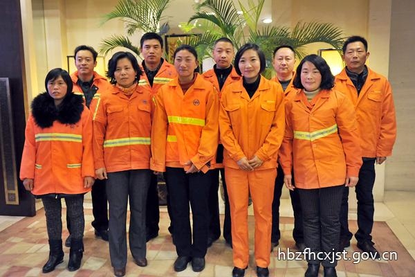 (图为“2013年度湖北好人-最美环卫工人”。第一排从左至右依次是:钟登义、杨建军、施绪珍、付莎莎、徐春枝;第二排从左至右依次是:邓元武、王江、聂祖义、徐声富、李晓斌)