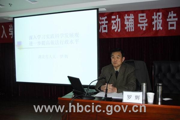 罗辉副主任作了题为《深入学习科学发展观 进一步提高依法行政水平》的辅导报告,他从几个现实的例子谈起,深刻阐释了科学发展观的内涵,进而提出学习实践科学发展观、牢固树立依法行政应树立的九个新理念:一是宪法至上的理念;二是尊重人权的理念;三是行政权限的理念;四是行政民主的理念;五是行政服务的理念;六是行政程序的理念;七是政府诚信的理念;八是监督责任的理念;九是权利救济的理念。对于如何推行依法行政,他提出了要求,即加强立法、执法、司法,把握好总体发展和局部实践的平衡。