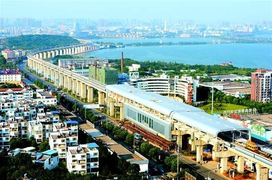 右图:俯瞰武咸城际铁路庙山至汤逊湖段,如卧龙出山,气势恢宏。(李溪)