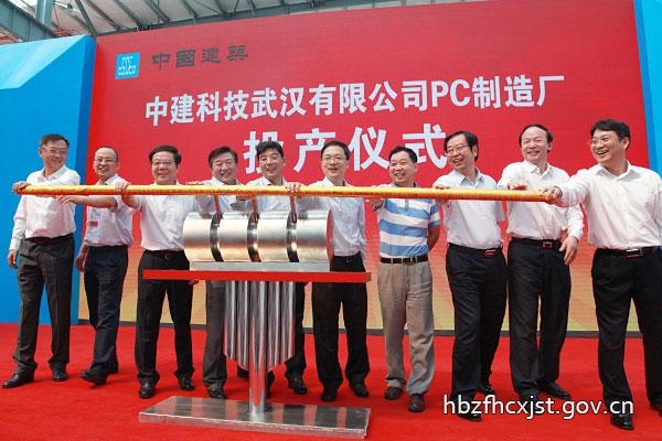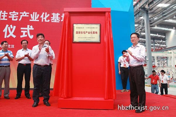 活动现场,王润涛、尹维真、刘立勇、刘锦章共同为武汉绿色建筑产业园奠基;曹广晶、官庆共同为中建三局国家住宅产业化基地揭牌;主席台各位领导共同推杆,宣告武汉市首个PC(预制混凝土)构件厂正式投产,并观看了产业化项目首吊及建筑构件工业化生产。