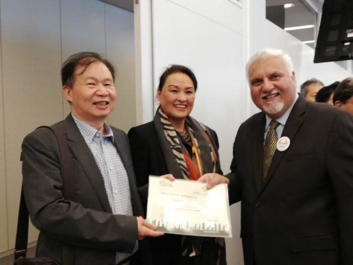图为副总经理肖伟代表中信设计接受亚建协主席颁发的参展荣誉证书