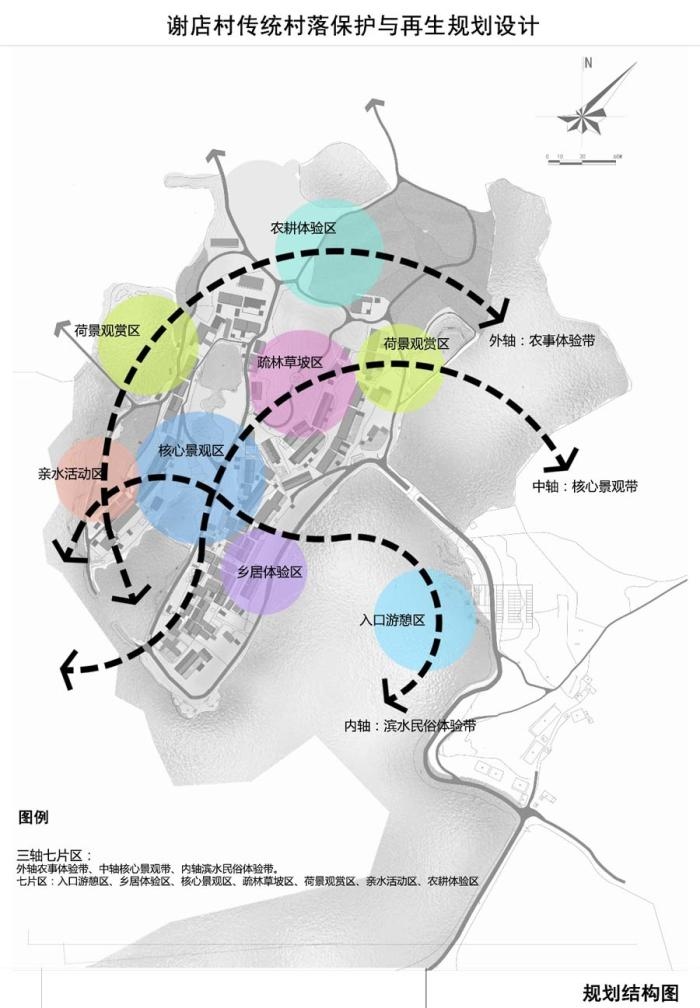 充分尊重古村落原始风貌,顺应其空间肌理,保留场所记忆;环境干预最低化、场地介入最小化、场地环境资源利用最大化,减少对传统村落的冲击;打造“绿水两轴,东南聚气;三带七区,环环相抱”的古村新貌。