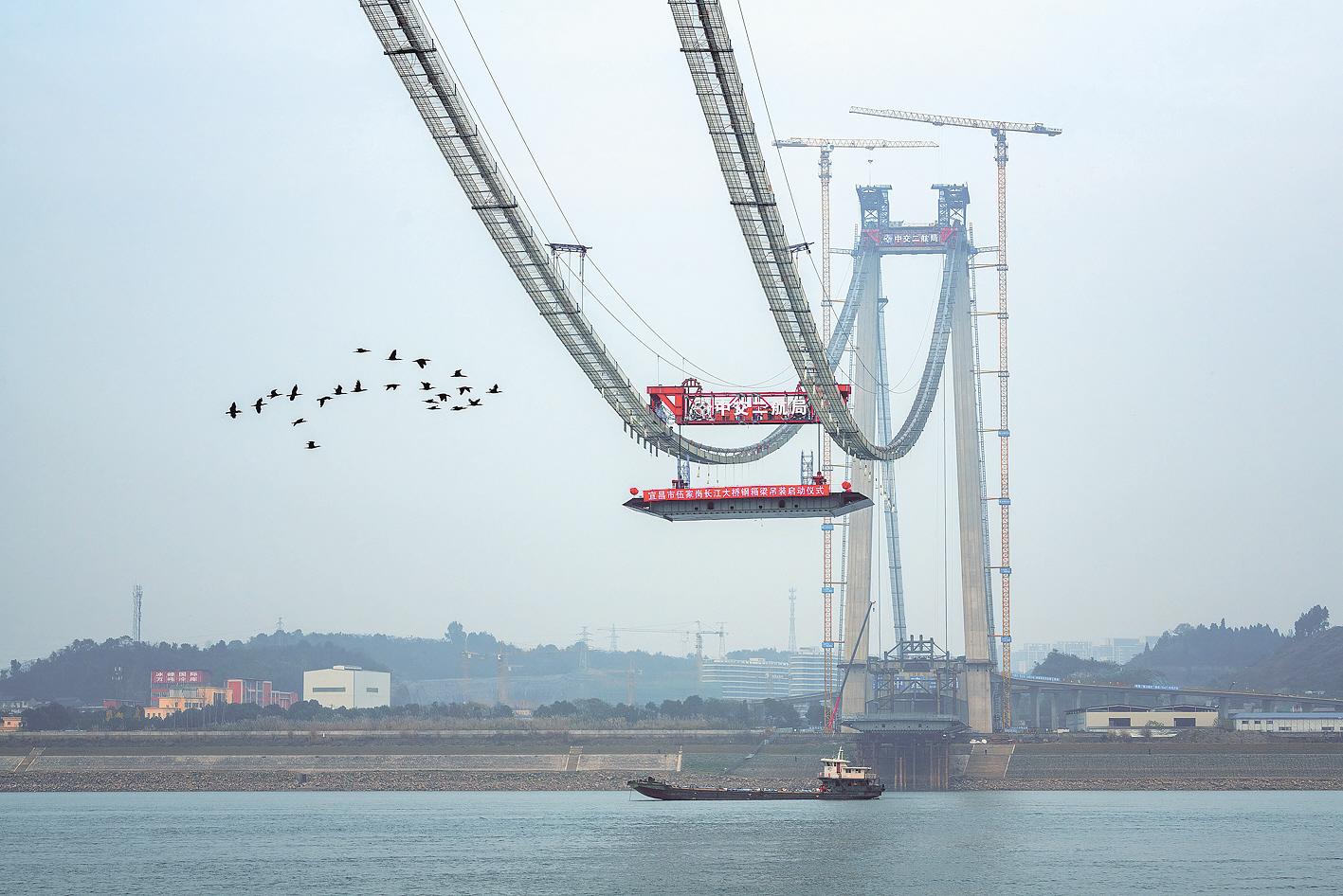 12月8日,宜昌市伍家岗长江大桥主跨第一片钢箱梁吊装,按计划明年1月中旬整个主跨钢箱梁吊装完毕。宜昌市伍家岗长江公路大桥是国务院确定的《长江经济带综合立体交通走廊规划》中湖北省19条过江通道之一。为保护中华鲟、江豚等长江珍稀生物,该桥采用主跨1160米悬索桥一跨过江的方案,按城市快速路、双向六车道标准设计建造。(王耿)